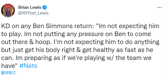 谈到西蒙斯复出这件事,杜兰特表示:我并不指望他上场。我没有给西蒙斯施加任何额外的压力,让他上场打球。我不期望他做任何事情,只是希望他的身体尽快恢复,并尽可能快地恢复到完全健康。