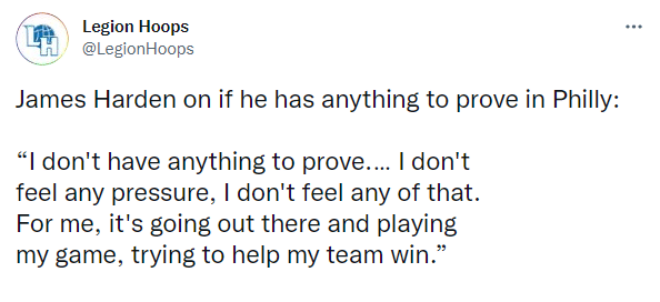 今年的季后赛是否有什么东西要证明吗?哈登回应:不,没有,我不喜欢这样对我个人来说,我总是想上场打好比赛,尽我所能做出贡献,努力帮助我的球队赢球,我没有感到任何压力,我没有任何压力!