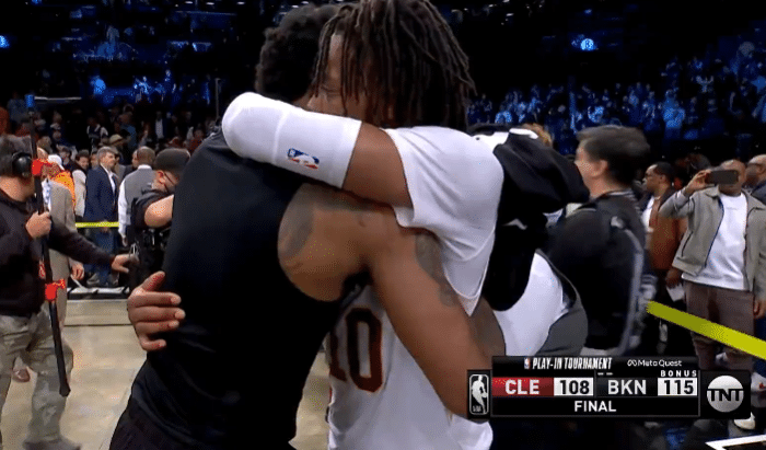 欧文比肩詹姆斯创纪录,成为复赛园区詹姆斯之后首位以80%命中率砍下至少30分10助攻的球员;杜兰特和欧文成为篮网队史第三对轰下25+10的组合;篮网晋级季后赛赛后,欧文又和杜兰特做出亲密的勾手庆祝动作;欧文还脱掉原味球衣,拥抱骑士球星加兰德。