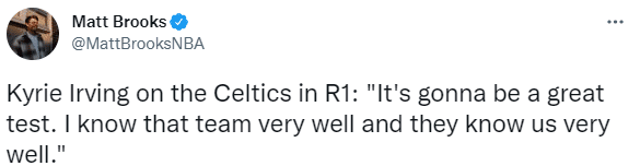 回应首轮对阵凯尔特人,欧文表示:这将是一个很好的考验。我非常了解那支球队,他们也非常了解我们。
