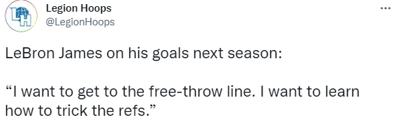 当被问到今年休赛期他想在训练中提升自己比赛的哪个方面,詹姆斯表示:我想站上罚球线。所以我想搞明白如何能够骗过裁判。我想搞清楚这个问题。我需要解决它;我看到了太多关于禁区得分的数据统计,我在合理冲撞区内的场均进球数排名联盟第一,但我的场均罚球数却排在联盟末端,我会解决好这个问题的。