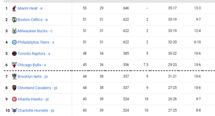 来源:JRS直播网04-11 16:24JRS直播网04月11日讯 ,东部常规赛的最终排名出炉!热火拿到东部常规赛冠军,凯尔特人最后时刻升至第二,雄鹿排名第三,费城排名第四。第5到第10的分别是猛龙、公牛、篮网、骑士、老鹰和黄蜂。