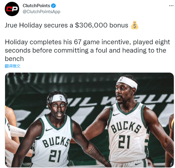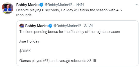 薪资专家Bobby Marks报道,只要霍勒迪本赛季出战场次达到67场且场均篮板高于3.15,他便可以拿下30.6万美元的奖金;因此霍乐迪选择出战,仅打8秒便下场休息,本赛季场均67场且篮板达到标准,30.6万美元奖金到手了。