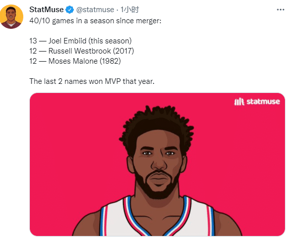 第5、恩比德单赛季13次40+10创造联盟合并以来单赛季个人球员最高纪录,超越威少和摩西-马龙成为NBA合并以来历史第一人,当年威少和马龙都夺得MVP。