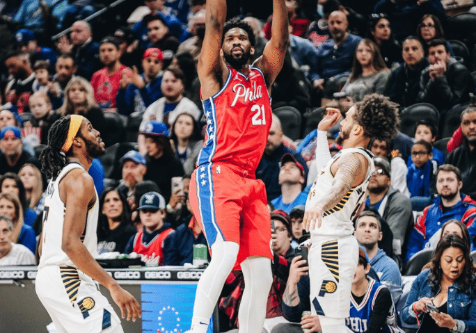 76人主场击败步行者,拿到常规赛第50胜并且锁定季后赛主场优势,哈登16投7中拿到22分14助攻4篮板,恩比德全场出战36分钟,17投14中高效轰下41分20篮板4助攻2抢断1盖帽的疯狂数据,大帝带队赢球,又狂刷多项历史纪录。