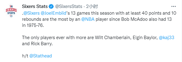 第1、恩比德成为本赛季唯一一位单场轰下40+20的球员