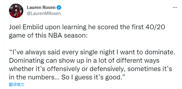 第3、恩比德成为历史第5位单场40+20且命中率至少80%的球员,另外鲍勃-佩蒂特、张伯伦(6次)、 约翰-德鲁和巴克利曾做到过。