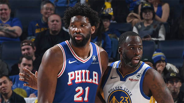 下半场,恩比德第三节命中空位三分,之后76人被勇士打出17-4攻势,科尔克马兹为费城输送火力,恩比德强吃格林轻松得分,2分44秒恩比德吃到第4犯,双手扶着膝盖十分疲惫,随后下场休息;76人众将继续反扑,库明加和戴维斯助勇士稳住局面,三节打完76人落后9分。