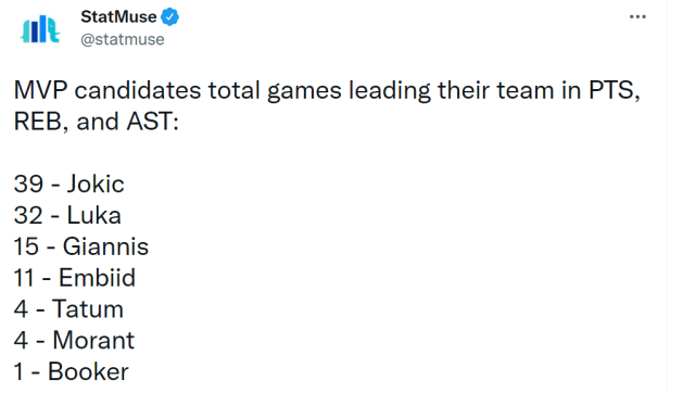 美媒Statmuse统计显示,在所有竞争MVP的球员中,约基奇累计39场比赛得分、篮板、助攻都排名全队第一,是最多的。离他最近的是东契奇(32场),此外,字母哥15场,恩比德11场,塔图姆和莫兰特各4场,布克1场。