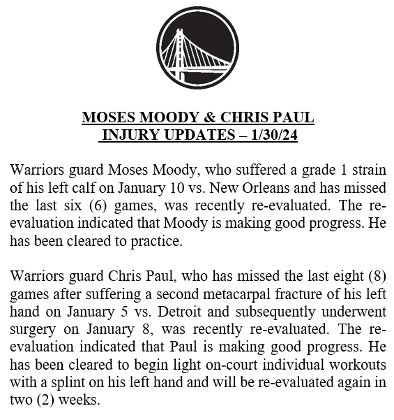 来源:JRS直播网01-31 10:27JRS直播网1月31日讯 ,勇士官方更新球队的伤情,保罗已经被允许回到球场进行轻量训练,因左手骨折将至少再缺席两周,穆迪的小腿伤势已经无大碍了,他已经恢复了训练并且接近复出。