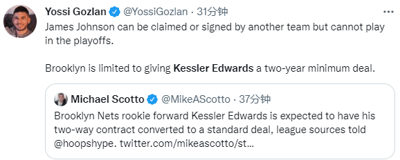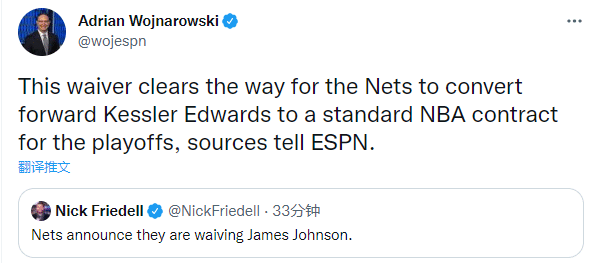 篮网裁掉悍将的原因有二;ESPN名记沃纳罗斯基跟进报道称,篮网裁掉詹姆斯-约翰逊是为了腾出名额,给二轮秀爱德华兹一份正式合同;篮网将把爱德华兹的双向合同转化为标准NBA合同,后者将因此具备出战季后赛的资格。