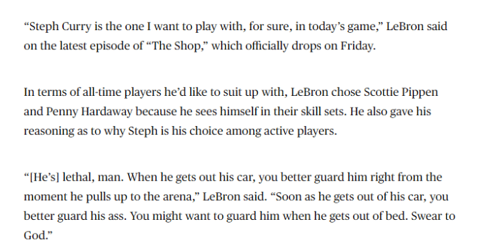 詹姆斯还解释:当他(库里)下车时,你最好从他停车的那一刻起就防守他,你或许得从他下床的时候就开始去防他,我向上帝发誓。
