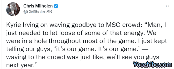谈到朝尼克斯球迷挥手说再见,欧文表示:伙计,我只是需要释放一些能量。我们在比赛的大部分时间都处于困境。我只是一直告诉我们的球员“这是我们的比赛。这是我们的比赛”,向球迷挥手就像我们明年再见!