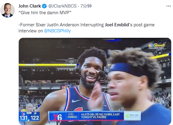 来源:JRS直播网04-06 16:05JRS直播网04月06日讯 ,恩比德暂时成为联盟得分王,他不仅冲击生涯第一个得分王,而且冲击生涯第一个MVP;赛后名嘴帕金斯直言他会把MVP第一选票投给恩比德,前76人球员贾斯汀-安德森打断恩比德的采访,并且直言:把MVP给他!