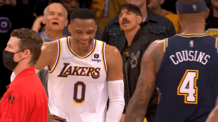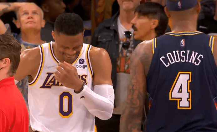 湖人主场对阵掘金,上半场最后时刻,威少残暴隔扣考辛斯引热议,神龟炸裂一扣点燃替补席和整座球馆,詹姆斯等队友起立庆祝,威少露出发狠表情,之后站在考辛斯身旁咧嘴大笑太开心。