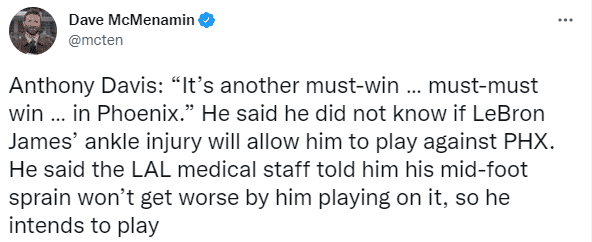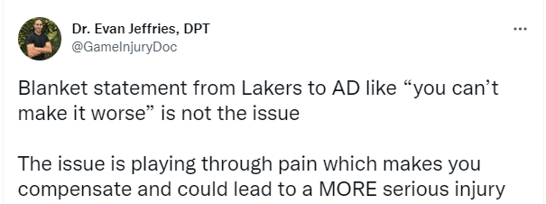 浓眉选择带伤出战的一大理由是湖人队医告诉他伤情不会恶化;对于医学专家Evan Jeffries表示问题在于浓眉脚踝痛疼,这可能导致更严重的伤病。