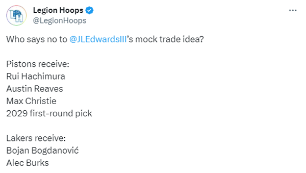 湖人和老鹰谈僵的另一个原因是湖人一直拒绝交易里夫斯;近日湖人队记Jovan Buha和活塞队记James L. Edwards III讨论了活塞和湖人可能的交易。