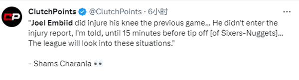 据名记shams报道,NBA联盟将介入调查恩比德临时缺战掘金一事,若存在违规的情况,76人和恩比德可能被联盟追加处罚。
