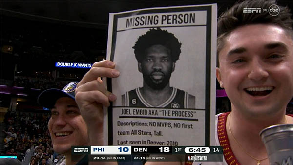 在76人和掘金大战前一天,恩比德不在76人伤病名单上,距离比赛当天还剩2个小时,名记报道恩比德确认可以出战,然而开赛前15分钟,恩比德因左膝酸疼而缺席这一场与约基奇的焦点对决,恩比德临时退赛引发巨大争议,掘金球迷在现场疯狂嘲讽恩比德临阵退赛。