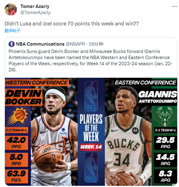 值得一提的是,NBA官方宣布字母哥和布克获得上一周东西部周最佳球员,名记为上一周同砍70+的恩比德和东契奇鸣不平。