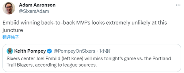 目前76人29胜15负排在东部第3位,本赛季,76人还剩下40场常规赛,若恩比德再缺席6场,他将无缘MVP等任何奖项;对于恩比德的情况,76人记者Adam Aaronson表示,目前来看,恩比德蝉联MVP的可能性极小。
