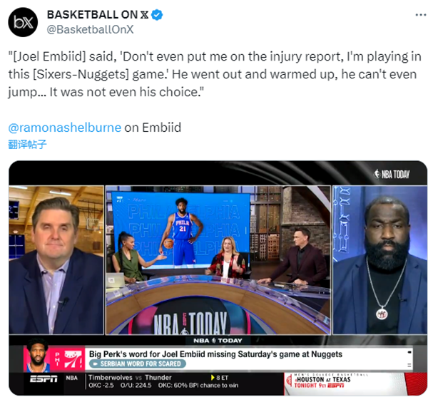 究竟恩比德是真伤还是炸伤?据ESPN名记Ramona Shelburne报道,恩比德本人想打却被球队拒绝了,她表示:当球队要公布伤病名单时,恩比德说,‘别把我放在伤病名单上,我要出战这场比赛。’然后热身的时候,他甚至无法起跳,膝盖伤势让他很不舒服。这甚至不是他能决定的,球队伤病管理人员不允许他上场。联盟将会调查,可能会罚他们的钱,但这一切起源是这位球星让球队别把他放入伤病名单,他想打。