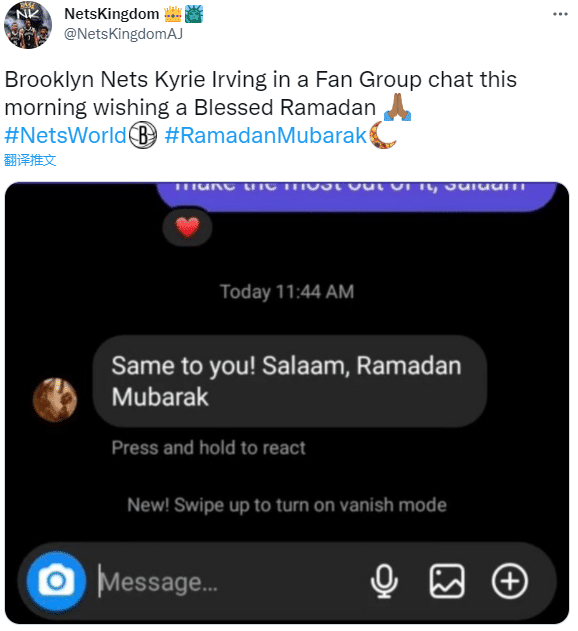 不久前,欧文发推写道:斋月开始了...谢谢你,真主;请指示我所有的兄弟/姐妹、国王/王后。