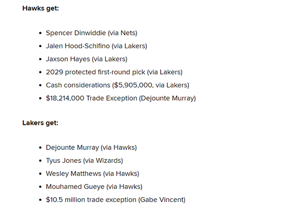 老鹰得到:丁威迪(来自篮网)、席菲诺、海斯、2029年受保护首轮签、590万美元现金(来自湖人)、1821万美元的交易特例