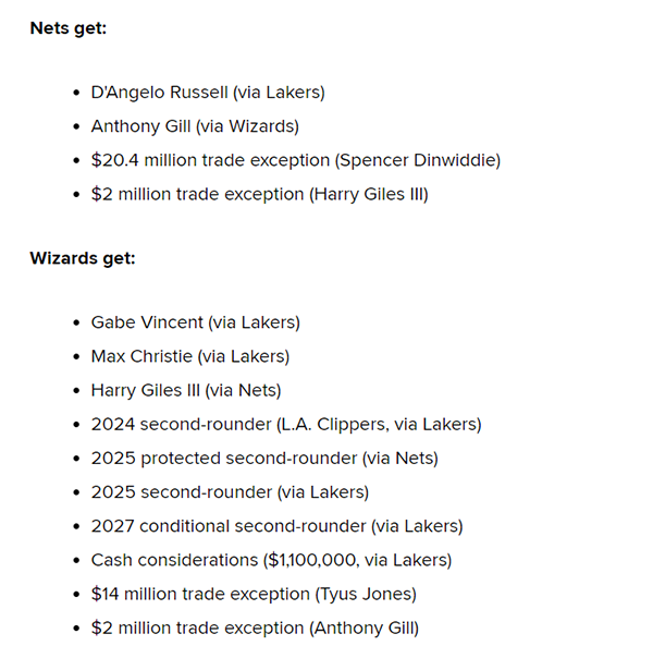 奇才得到:文森特、克里斯蒂、哈里-贾尔斯三世、2024年次轮(来自湖人)、2025年受保护次轮(来自篮网)、2025年次轮(来自湖人)、2027年次轮(来自湖人)、110万美元现金(来自湖人)、1400万美元和200万美元的交易特例。