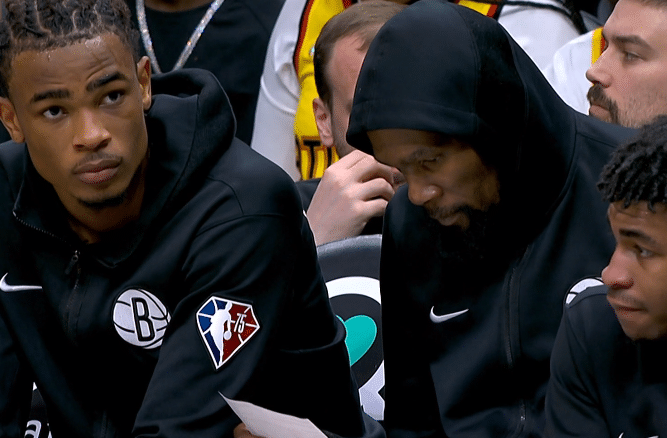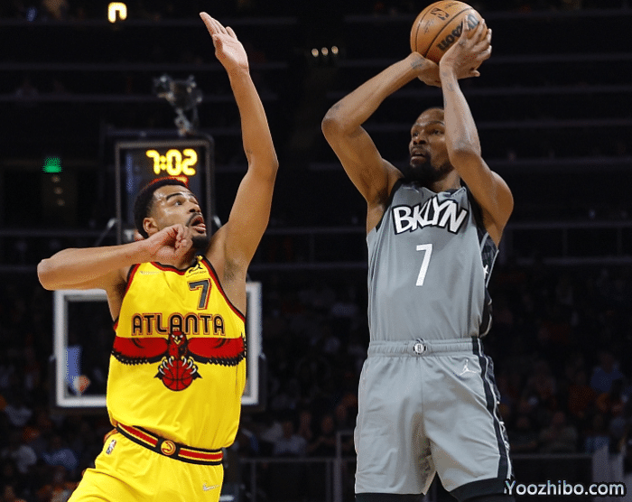 第二节,杜兰特坐在替补席休息并且看数据统计表,欧文单核带队被老鹰反超,6分19秒,杜兰特重新上场,死神再次开火,无解中投、外线三分以及强硬2+1,欧文也续上三分火力,篮网疯狂追分,可上半场最后76秒,篮网被老鹰打出8-0,特雷-杨压哨上篮,篮网半场落后15分,单节20-37狂输17分,杜兰特一人贡献10分。