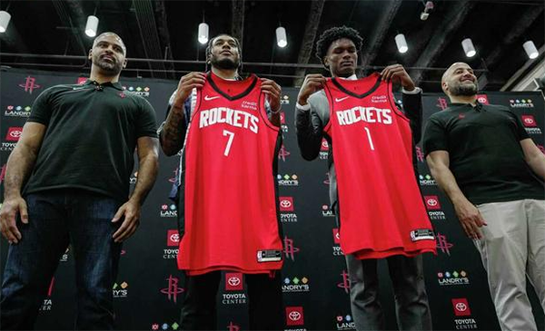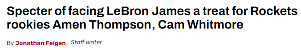 今日湖人客场挑战火箭,詹姆斯身穿一套休闲装、戴着棒球帽入场;据火箭记者Jonathan Feigen报道,火箭两大新星惠特摩尔和阿门-汤普森都视詹姆斯为偶像。