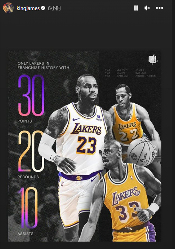 上一场湖人双加时险胜勇士,39岁的詹姆斯全场拿到36分20篮板12助攻,第二个加时最后时刻罚球准绝杀;詹姆斯成为湖人队史埃尔金-贝勒和贾巴尔之后第三位单场至少30分20篮板10助攻的球员,今日詹姆斯通过社媒转发了这一纪录。