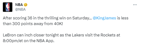 来源:JRS直播网01-30 17:12JRS直播网1月30日讯 ,在湖人对阵火箭赛前,NBA官方再次为詹姆斯40000分里程碑而预热,配文写道:在周日轰下36分后,詹姆斯距离40000分还差不到300分;今日湖人客场挑战火箭,詹姆斯将更加接近40000分。