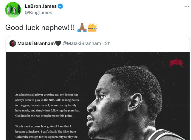 詹姆斯一直关注布拉纳姆的成长,这位年轻人当选俄亥俄篮球先生时,詹姆斯也曾专门更新社媒送上祝贺,称赞他已经获得的成就,并鼓励他继续前进。