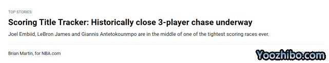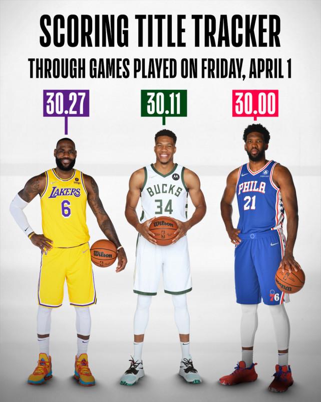 字母哥场均30.11分,虽然本场比赛轮休,但他已经连续两场40+,追赶势头很猛。恩比德过去3场比赛场均34.3分,目前场均得分30.00分,同样有机会冲击得分王的荣誉。詹姆斯现在领先字母哥0.16分,领先恩比德0.27分。