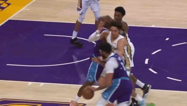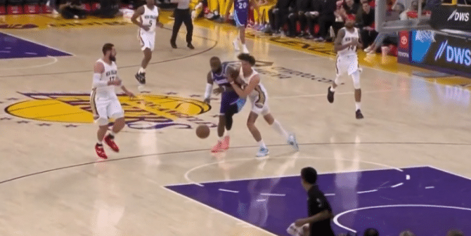 值得一提的是,詹姆斯在前一次进攻当中帮浓眉掩护之时撞到了海耶斯。