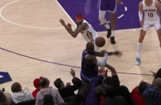 回到詹姆斯此役最令人尊敬的一幕。第三节还剩9分钟时,詹姆斯在一次救球过程中,在自己行将离开边线时,试图将球救回场内。但詹姆斯自己却直接摔进了观众席,来到二排观众的坐席上。好在詹姆斯没有大碍,但从这球也能看出,詹姆斯到底有多拼。