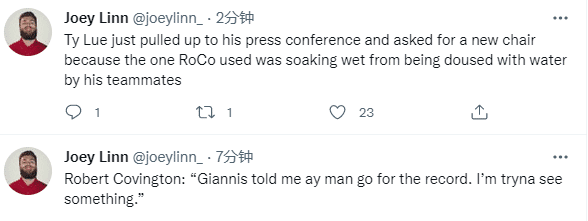 在新闻发布会现场,考文顿被队友疯狂浇水庆祝,由于椅子被浇透,泰伦-卢要求更换一把新的椅子,然后才接受采访。