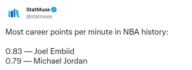 美媒StatMuse列出了一项数据:生涯至今,恩比德平均每分钟能得到0.83分,是NBA历史最高的,排名第二的是乔丹,平均每分钟0.79分。显然,恩比德的罚球也在其中扮演了重要的角色。