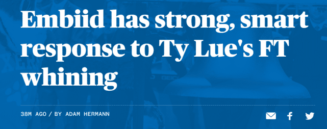 恩比德认为泰伦-卢的那番话,就是说给裁判听的,因为他们想让裁判不要吹给恩比德那么多罚球。“有一场比赛我获得27次罚球机会(2月28日对尼克斯一战),27罚23中,所以,下一场比赛我就知道我没法走上罚球线了,我知道裁判不会再吹了,因为我知道了这一点,所以我的心态就是打得更有侵略性,我会让裁判吹哨的。”