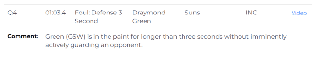 第二次漏判,出现在距离比赛结束还有1分3秒时,格林出现防守3秒违例。他在自己禁区没有积极防守一名球员,且待的时间超过3秒。裁判漏吹这个违例,同样是勇士获利。