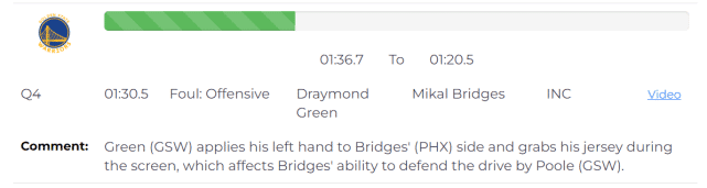 第一次漏判,出现在距离比赛结束还有1分30秒。勇士进攻的回合,格林为队友进行掩护时,抓住了布里奇斯的球衣,影响了布里奇斯对普尔的防守。这是一次进攻犯规,裁判漏吹,勇士获利。