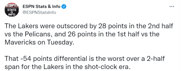 来源:JRS直播网03-31 17:40JRS直播网03月31日讯 ,ESPN数据显示,对独行侠一战的上半场湖人56-82净负26分,而对鹈鹕的下半场比赛,湖人39-67净负28分。湖人连续两个半场累计净负54分,创下队史计时器时代连续两个半场失分的最高纪录。