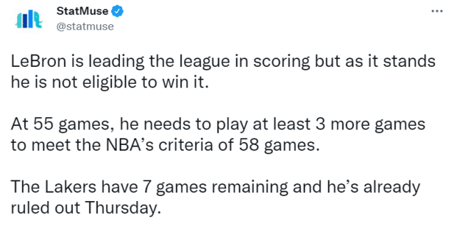 詹姆斯已经打了55场,需再打至少3场才符合得分王的评选资格。湖人还剩7场常规赛,他已确定缺席其中对爵士的比赛。