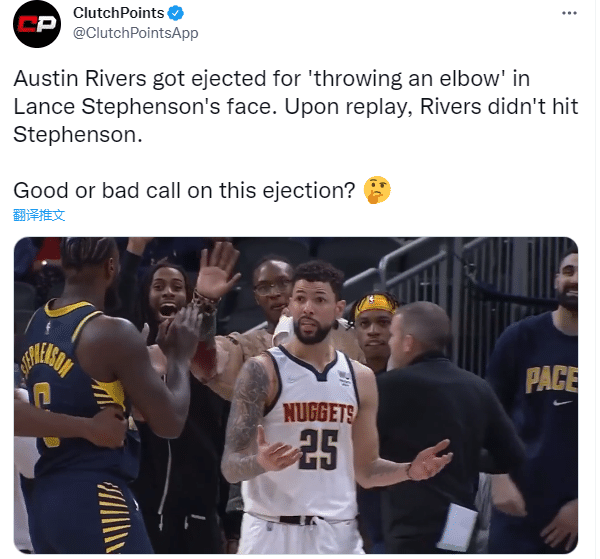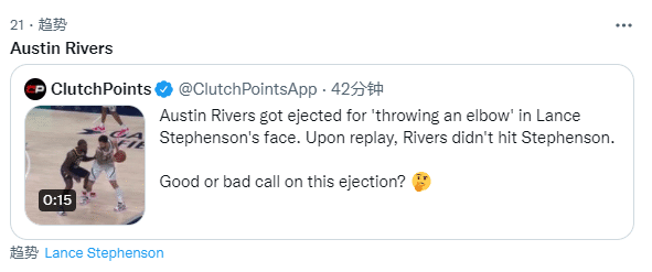 美媒Clutch Points发推写道:奥斯汀-里弗斯因“肘击”斯蒂芬森的脸而被驱逐。现场回放可以确认,里弗斯没有打到斯蒂芬森,这次驱逐是好还坏?