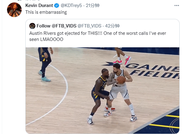 来源:JRS直播网03-31 16:18JRS直播网03月31日讯 ,掘金客场125-118击败步行者,末节场上发生意外事件,小里弗斯连续吃到两个技术犯规被驱逐离场,小里弗斯“肘击”史蒂芬森冲上热搜引热议,美媒直呼根本没打到师弟,杜兰特凑热闹,转发视频并发推:这也太尴尬了。