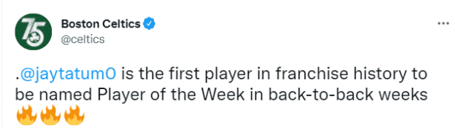 上周,凯尔特人获得3胜0负的战绩,塔图姆场均32分5篮板5助攻。绿军官方也晒图祝贺塔图姆,并配文写道:“塔图姆是凯尔特人队史上第一位连续两周当选周最佳的球员。”塔图姆本赛季四次当选周最佳,也追平了队史名宿伯德的纪录。