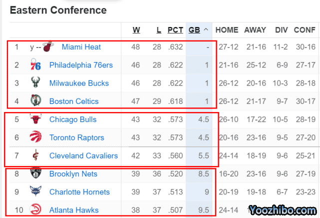 不只是前四不明朗,第五到第七,也很胶着。排名第五的公牛与第六的猛龙,同为43胜32负,排名第七的骑士42胜33负,距离他俩也只有1个胜场的差距。第八到第十的三支球队也黏在一起,篮网39胜36负,黄蜂39胜37负,老鹰38胜37负,他们之间也都只有0.5个胜场的差距。黄蜂输球,让篮网躺回到第八。