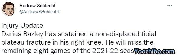 雷霆官方今日宣布,贝兹利遭遇右膝关节胫骨平台无位移骨折,将缺席本赛季剩余的八场比赛;本赛季贝兹利为雷霆出战69场,场均出场27.9分钟,得到10.8分6.3篮板1.4助攻0.8抢断1盖帽。此前多尔特、吉迪也因伤赛季报销。