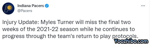 步行者官方宣布迈尔斯-特纳缺席常规赛最后两周的比赛,本赛季步行者还剩下7场比赛且早已无缘附加赛,这意味特纳赛季报销,他遭遇左脚应力反应;本赛季出战42场比赛,特纳场均拿到12.69分7.1篮板和2.8盖帽;目前步行者25胜50负排名东部第13位。